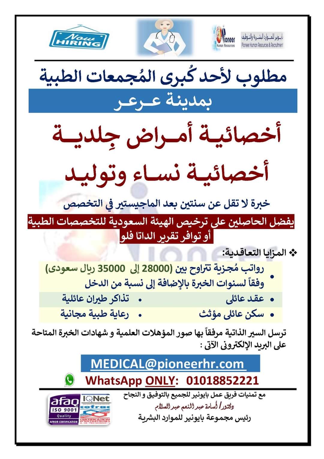 مطلوب أطباء جلدية ونساء وتوليد بمدينة عرعر