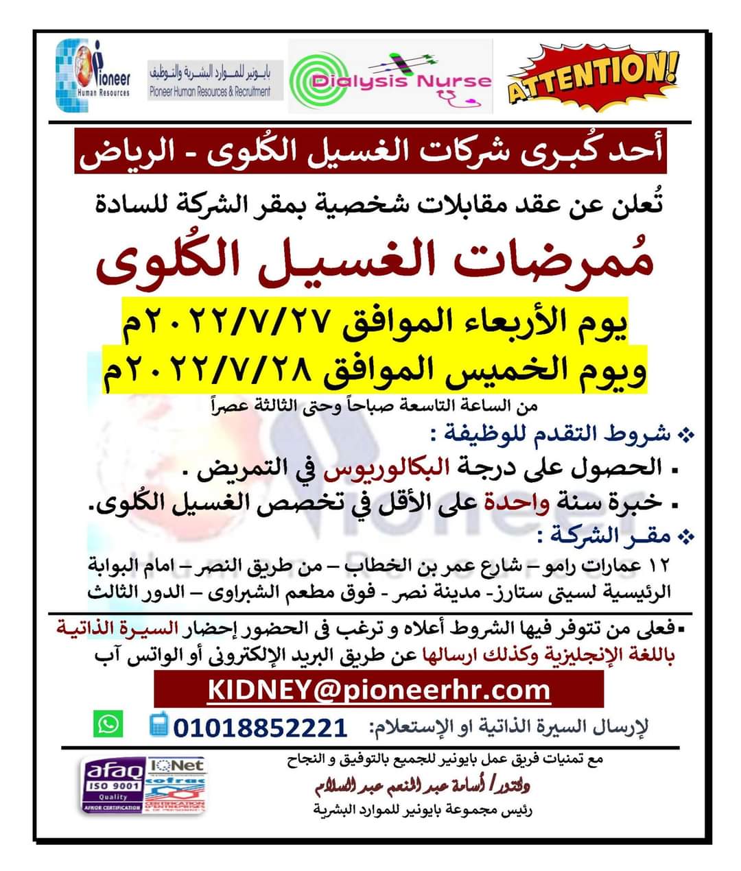 مطلوب ممرضات لكبرى شركات الغسيل الكلوى
