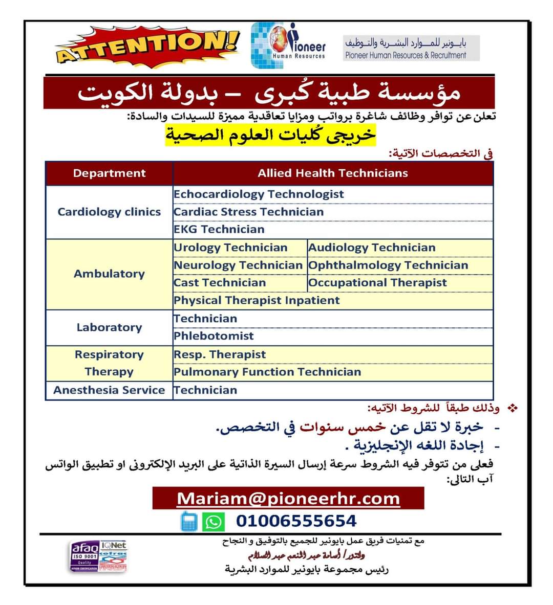 مطلوب خريجى كليات العلوم الصحية لمؤسسة طبية كبرى بدولة الكويت