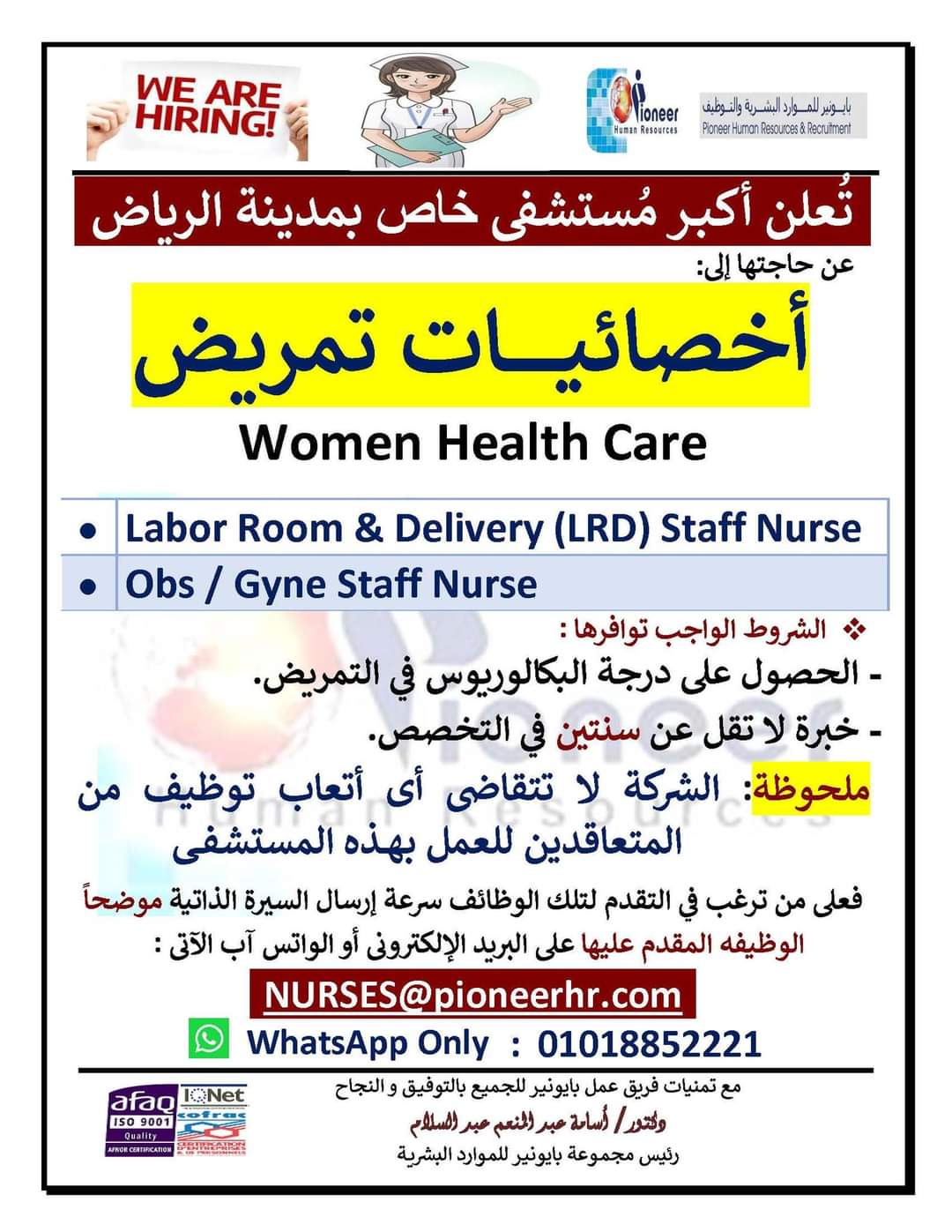 مطلوب اخصائيات تمريض للعمل بالرياض