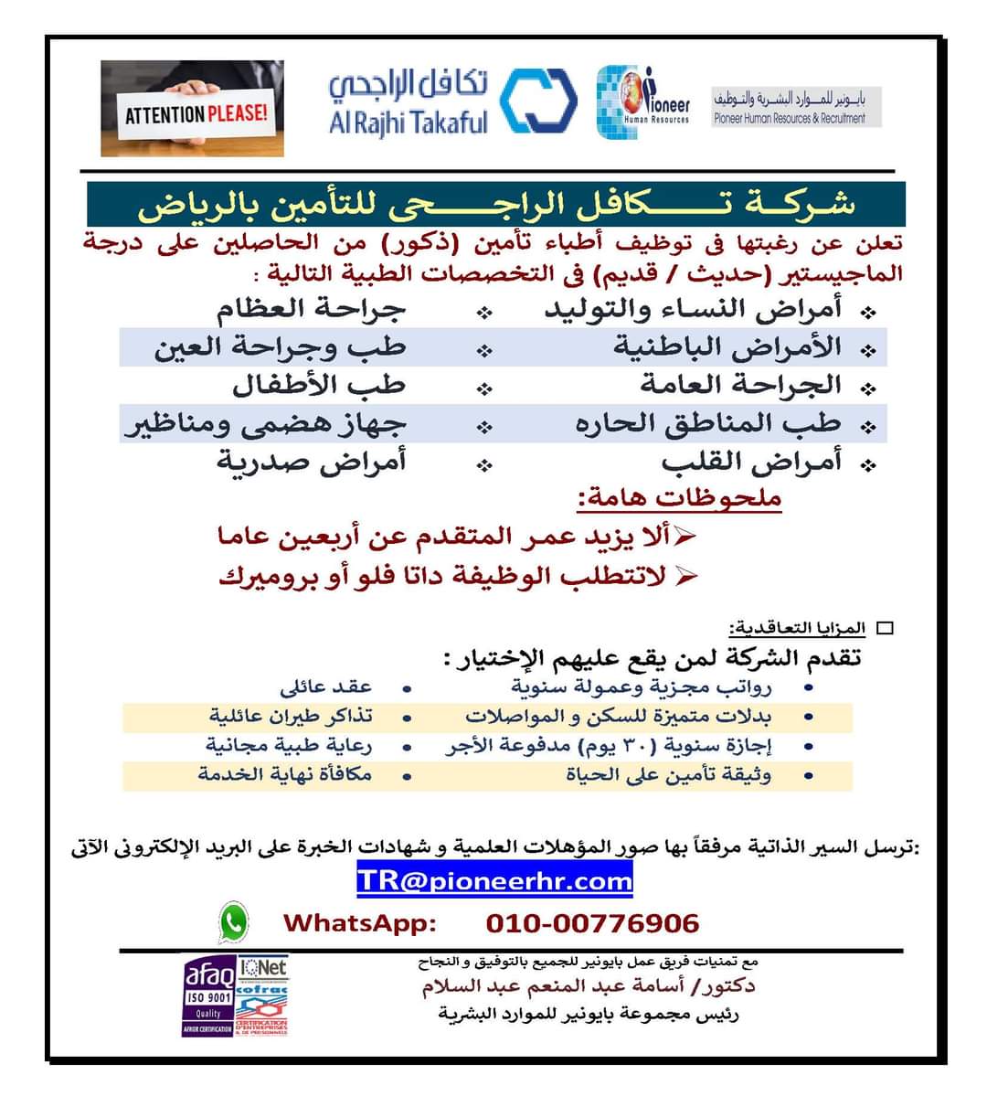 مطلوب أطباء لشركة تكافل الراجحى للتأمين بالرياض