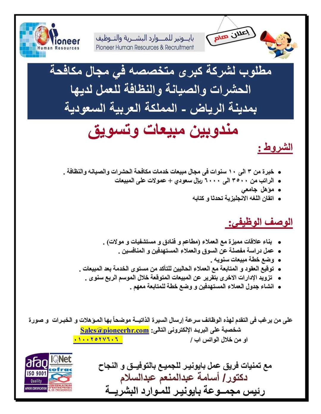 مطلوب لشركة متخصصة فى مكافحة الحشرات