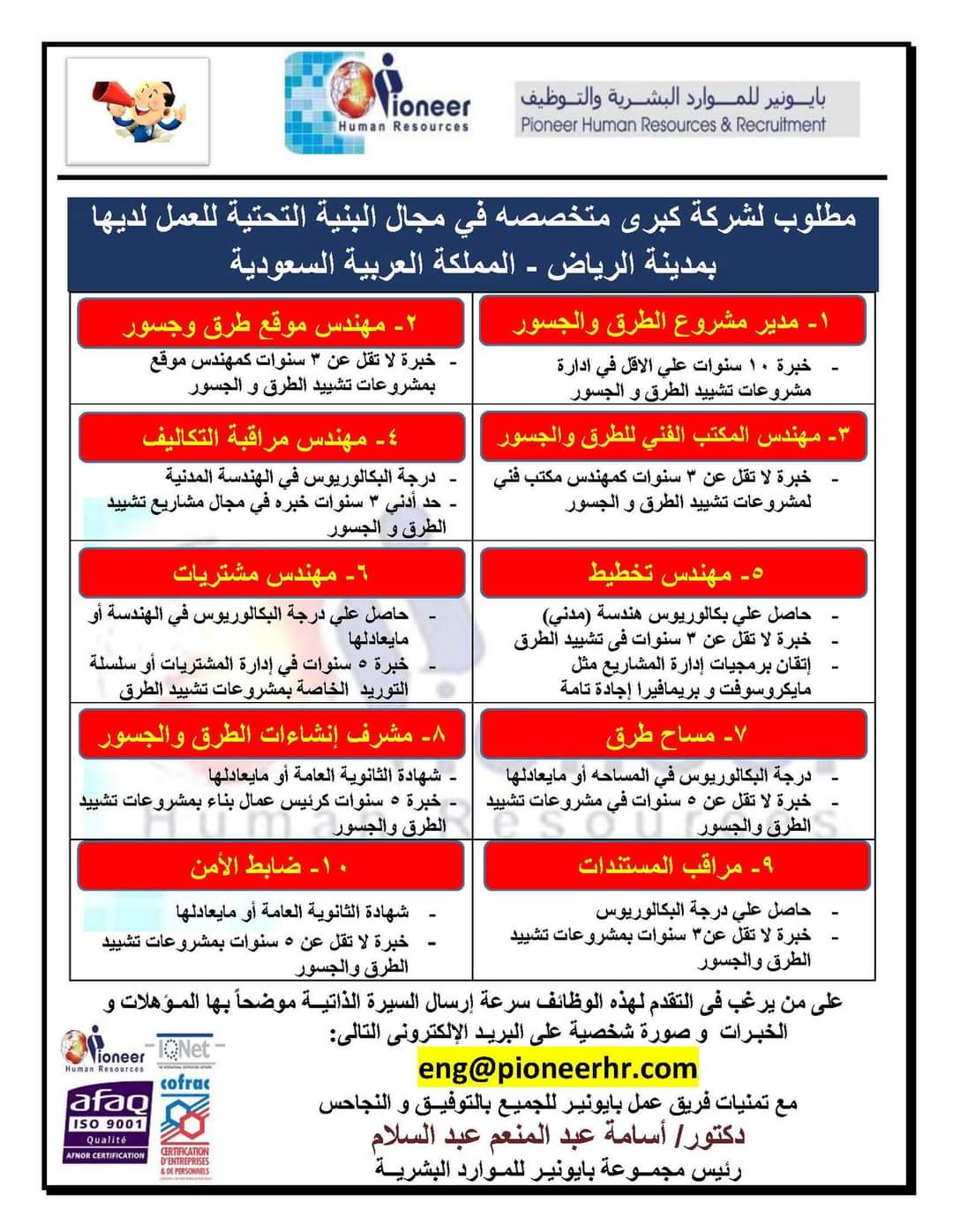 مطلوب لشركة متخصصة فى مجال البنية التحتيه للعمل لديها بالرياض