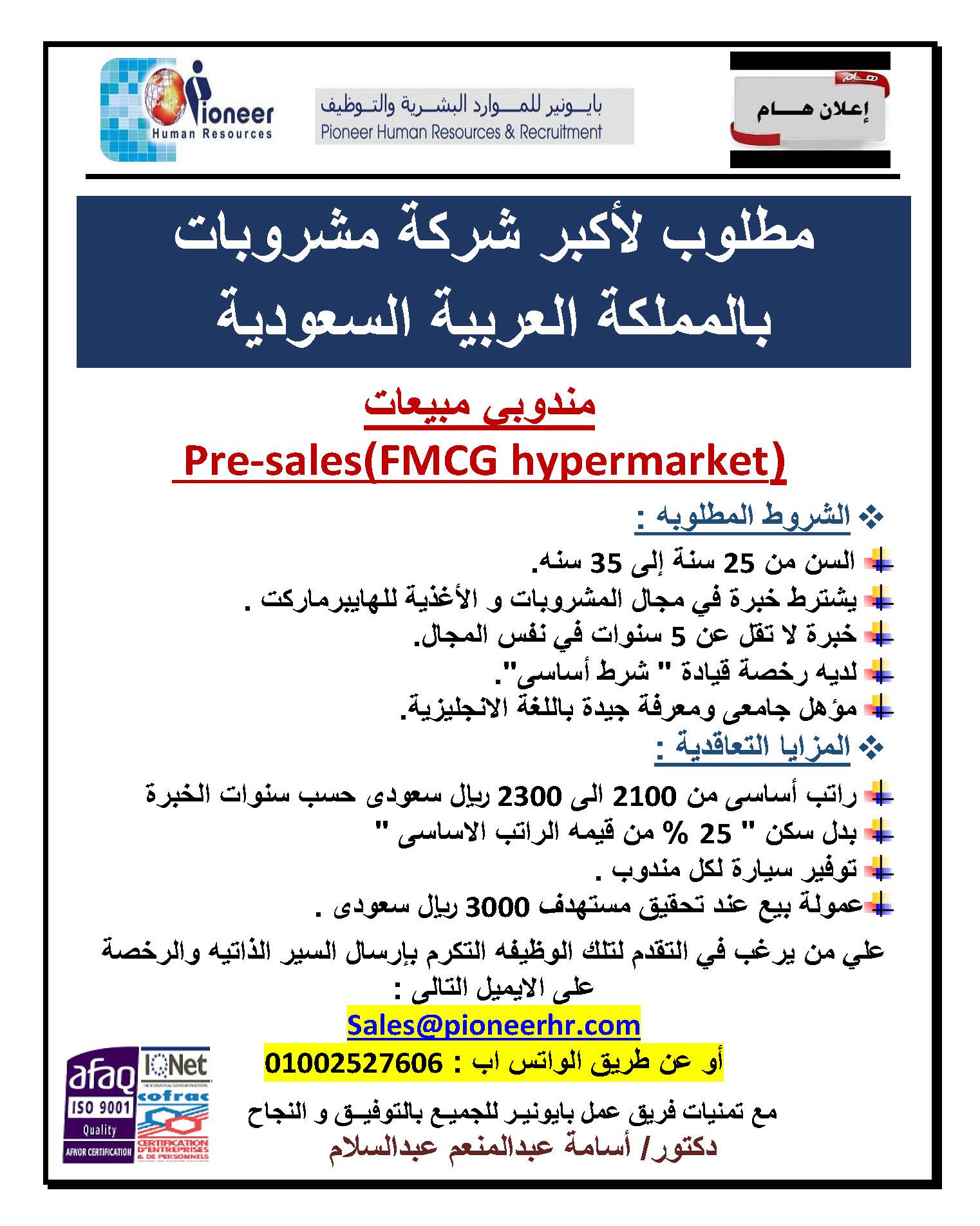 مطلوب لاكبر شركة مشروبات غازية بالسعودية “مندوبى مبيعات”