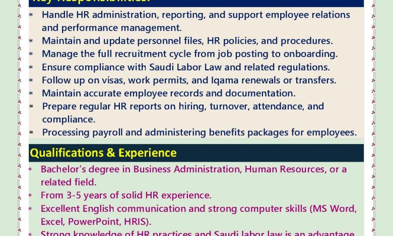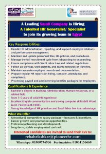 مطلوب وظائف لشركة سعودية رائدة عن أخصائي/أخصائي موارد بشرية موهوب للانضمام إلى فريقها المتنامي في مصر