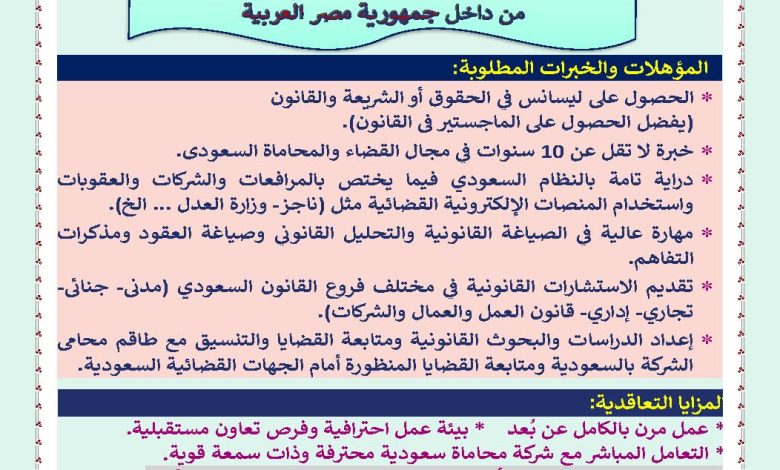 مطلوب مستشار قانونى لشركة محاماة سعودية