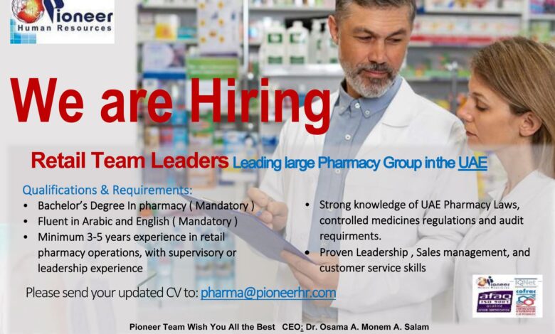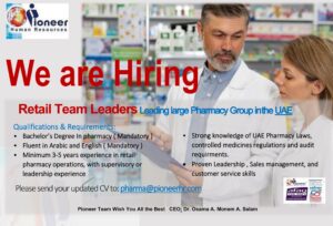 We are currently looking for experienced Retail Team Leaders to join a leading pharmacy group in the UAE.